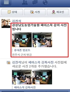 아이폰에서 페이스북 사진 여러장 올리기1 아이폰에서 페이스북사진 여러장 올리기, 새 사진첩 만들어 올리기 아이폰에서 페이스북사진 여러장 올리기 * 업그레이드글: 페이스북 사진 여러 장 올리기(PC/스마트폰) 아이폰 앱이 업그레이드된 후 사진올리기가 조금 바뀌었습니다.아래그림 ①은 아이폰에서 사진을 한 장 또는 여러장을 한꺼번에 올리는 방법입니다. [휴대폰업로드]사진첩에 저장됩니다. 아래그림 ②은 아이폰에서 사진첩을 새로 만들어서 사진을 여러장을 올리는 경우입니다. (1) 아이폰에서 페이스북 사진 올리기 (휴대폰 업로드 식) (1)사진 >[라이브러리에서선택]>카메라롤>원하는 사진을 누릅니다. (2)사진에서 [다음] 클릭 > 카메라 모양 >다시 카메라롤에서 사진을 선택해서 [다음]을 클릭합니다. 수십장도 첨부가 가능합니다. (3)설명 글 추가하여 [게시] 하면 오른쪽 그림처럼 보입니다. 현장에서 설명글과 함께 .. 2011. 11. 6. 이전 1 다음